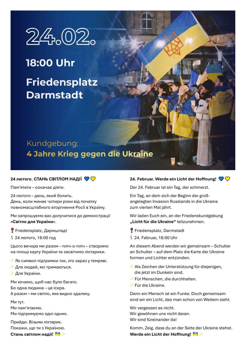 Weiterhin findet seit Kriegsbeginn jeden Samstag um 10.30 Uhr, also auch am 21.2.2026, auf dem Friedensplatz in Darmstadt eine Friedenskundgebung statt. Dazu gibt es auf unserer Webseite weitere Informationen.